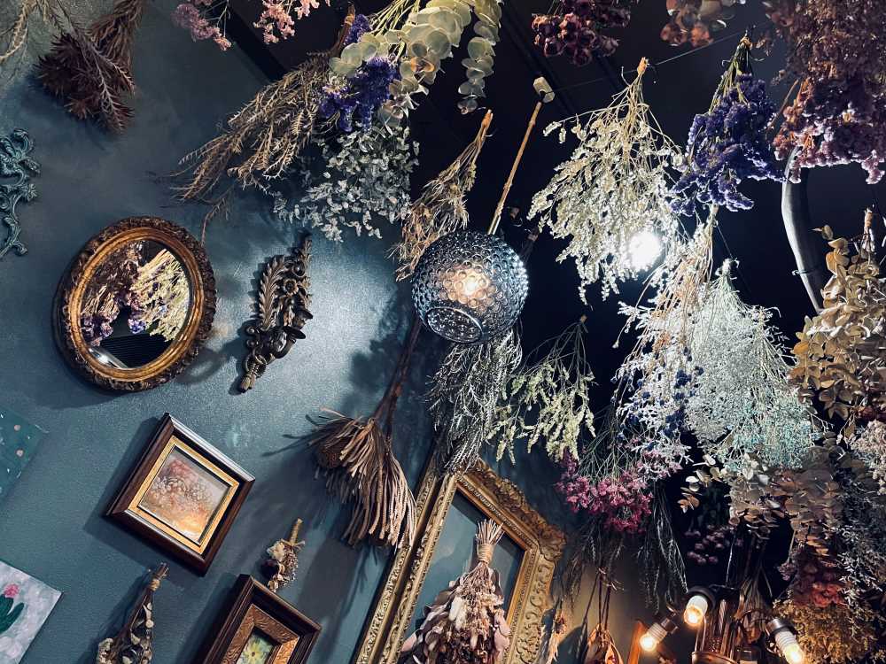 ドライフラワーに相性がいい、アンティーク調の雑貨もおしゃれ。